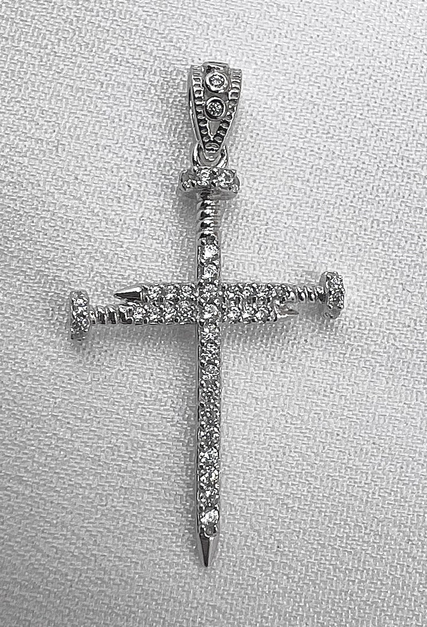925 Sterling Silver Rhodium Plated Cubic Zirconia Nail Cross with Plain Back - Double Sided